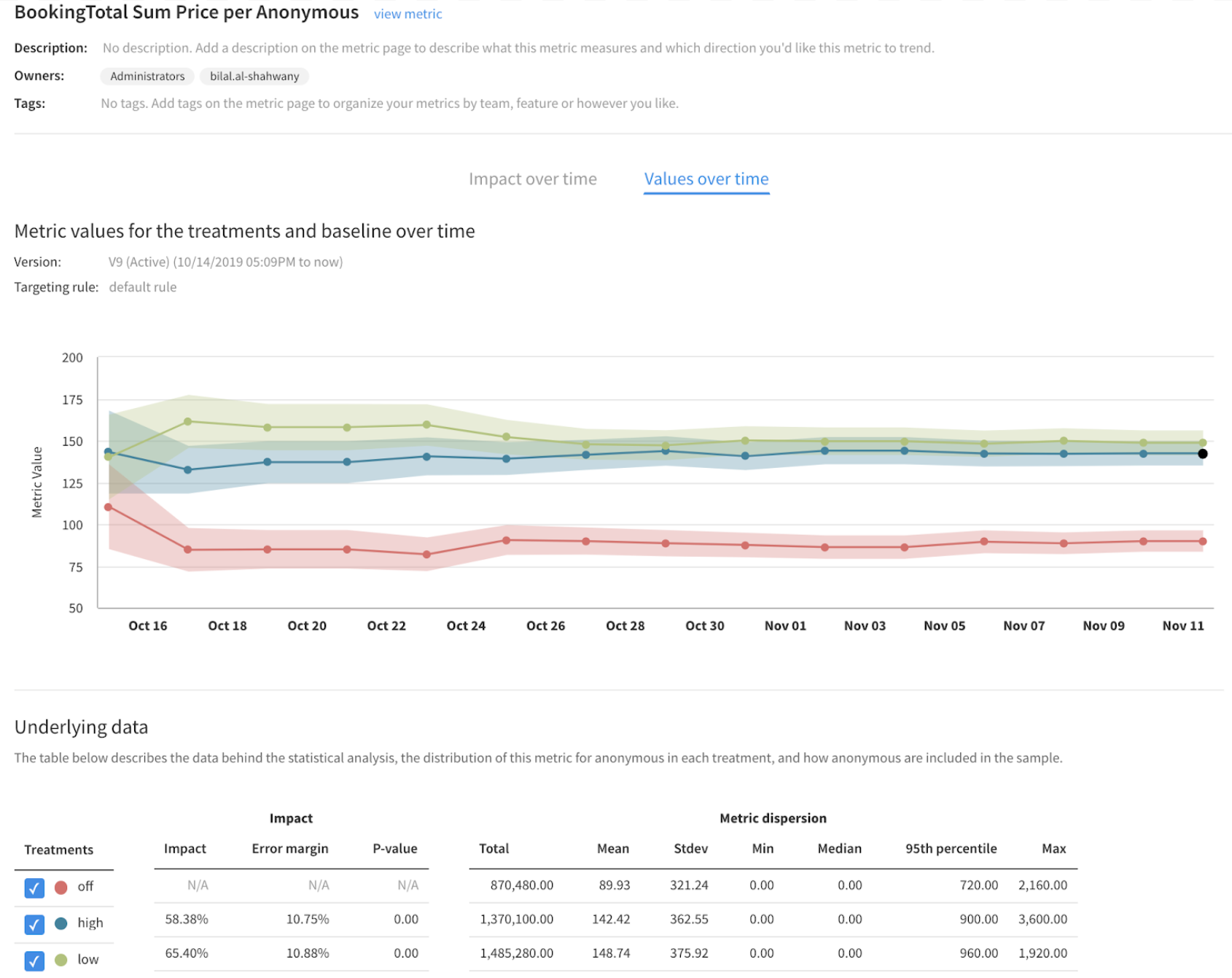 - Review the aggregated metric value for all treatments in the Values over time chart
