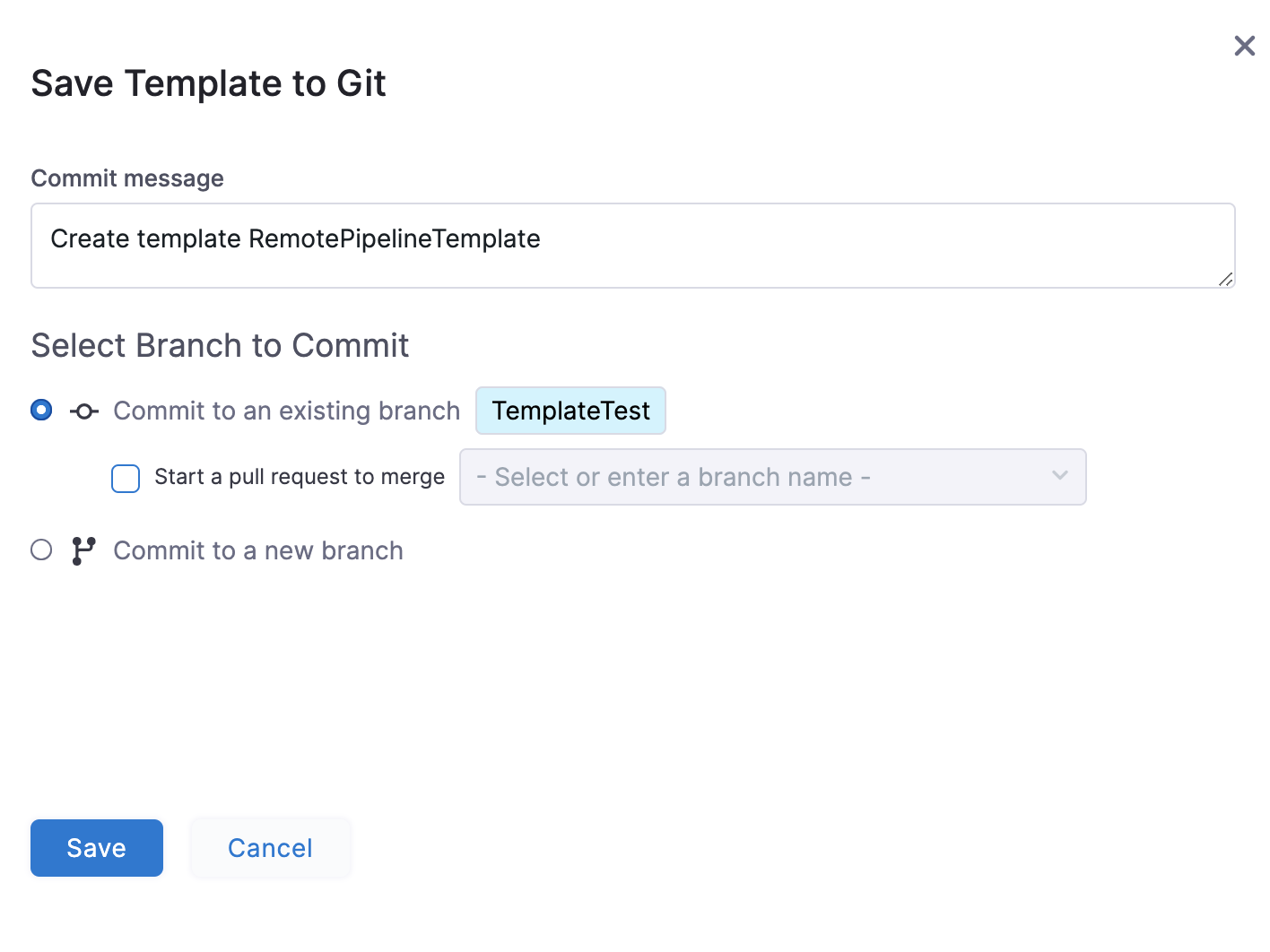 Select Save. Your remote pipeline template is saved to the repo branch.